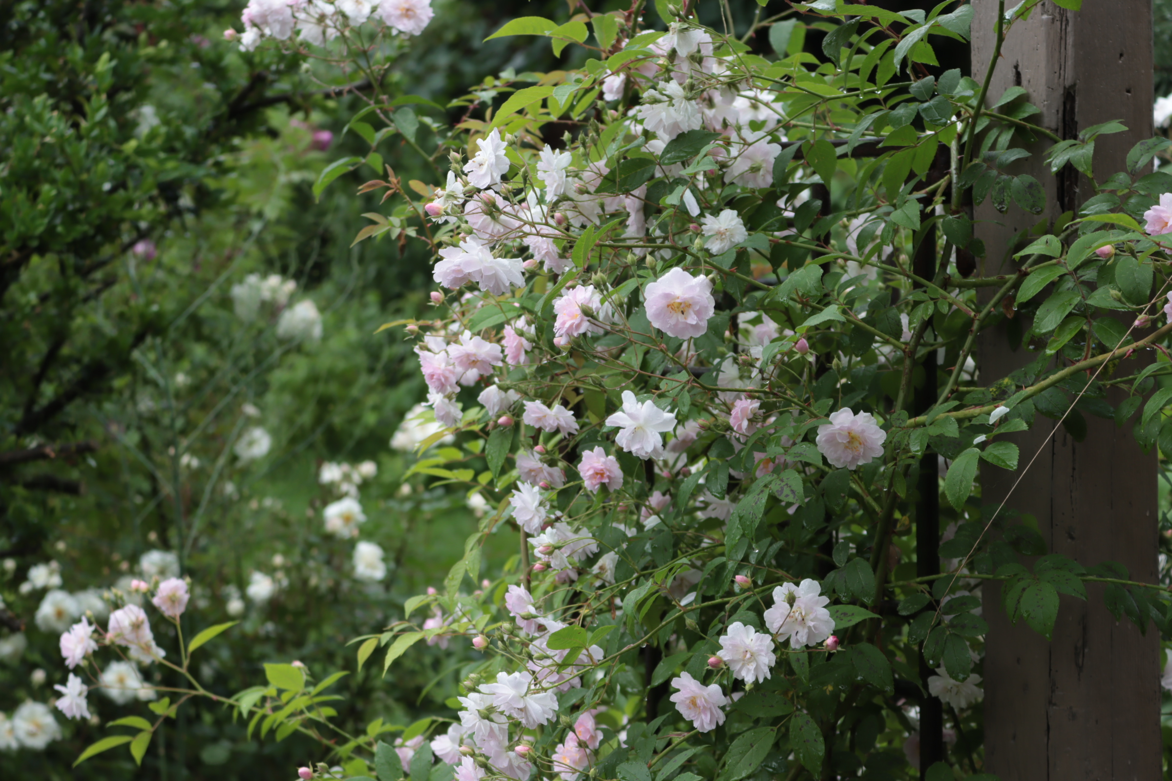 Vlevo je Paul´s Himalayan Musk, uprostřed jsou dvě neznámé bílé růže od paní sousedky Jany, které jsem s jejím dovolením zachránila vykopáním z její zahrady a přesazením do naší předtím, než prodala dům a než se z její zahrady stalo autovrakoviště.